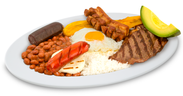 Frijoles, carne asada, chorizo, chicharrón, arepa, plátano maduro, morcilla, huevo frito, arroz y aguacate
