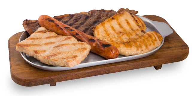 Carne de res, cerdo, pechuga, costilla de cerdo, chorizo, chicharrón, morcilla, plátano maduro, papa en cascos, papa criolla, arepa campesina y ensalada de la casa