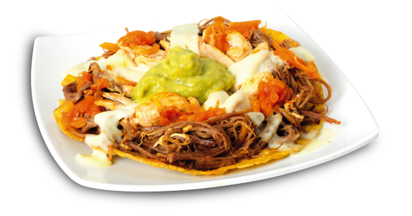 Carne de res, queso lechuga, guacamole, nachos y pico de gallo